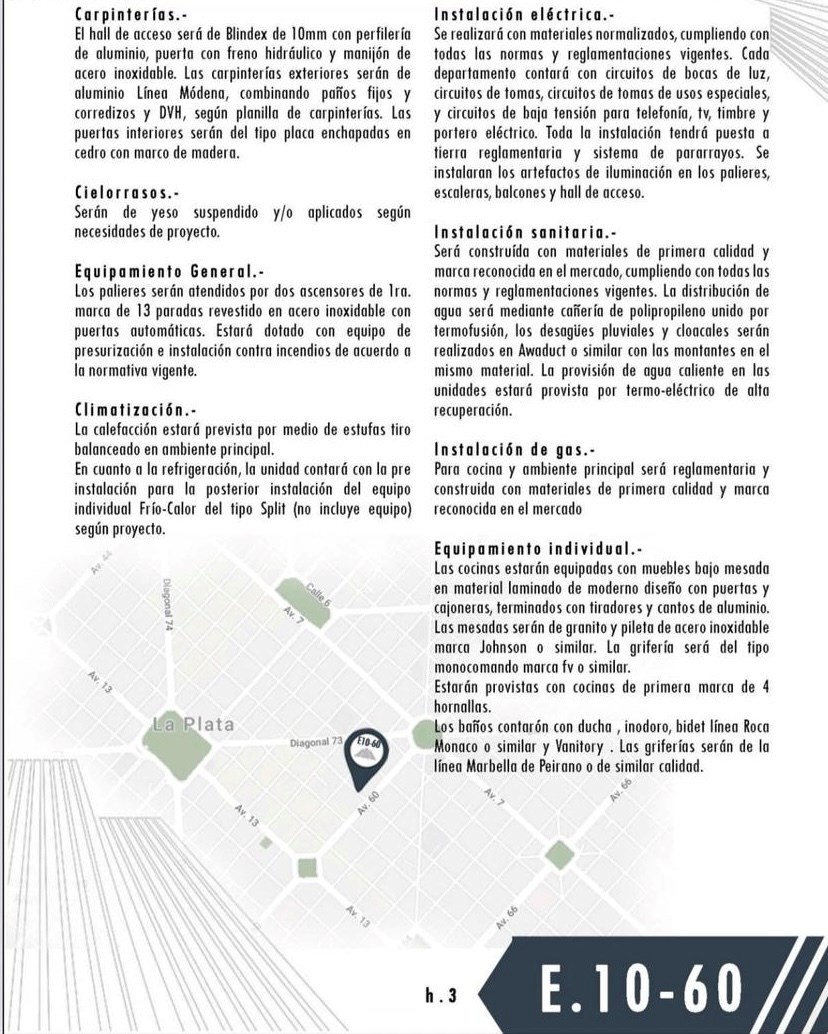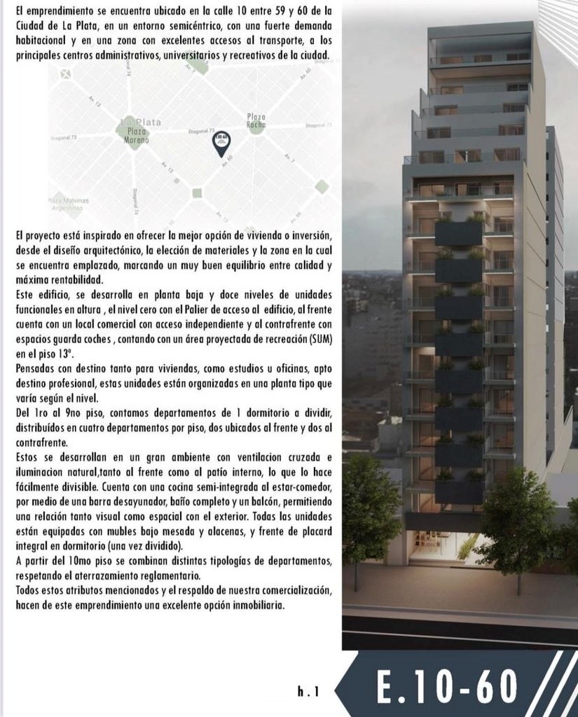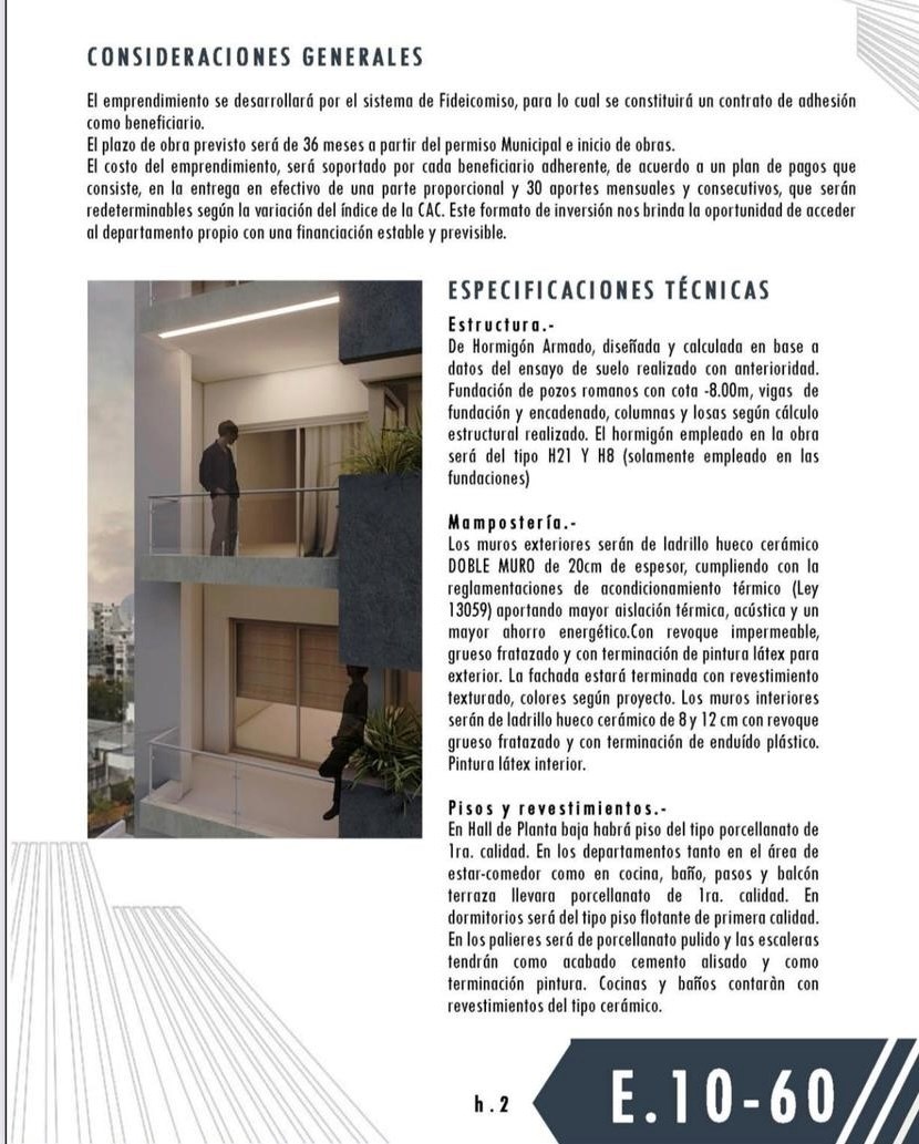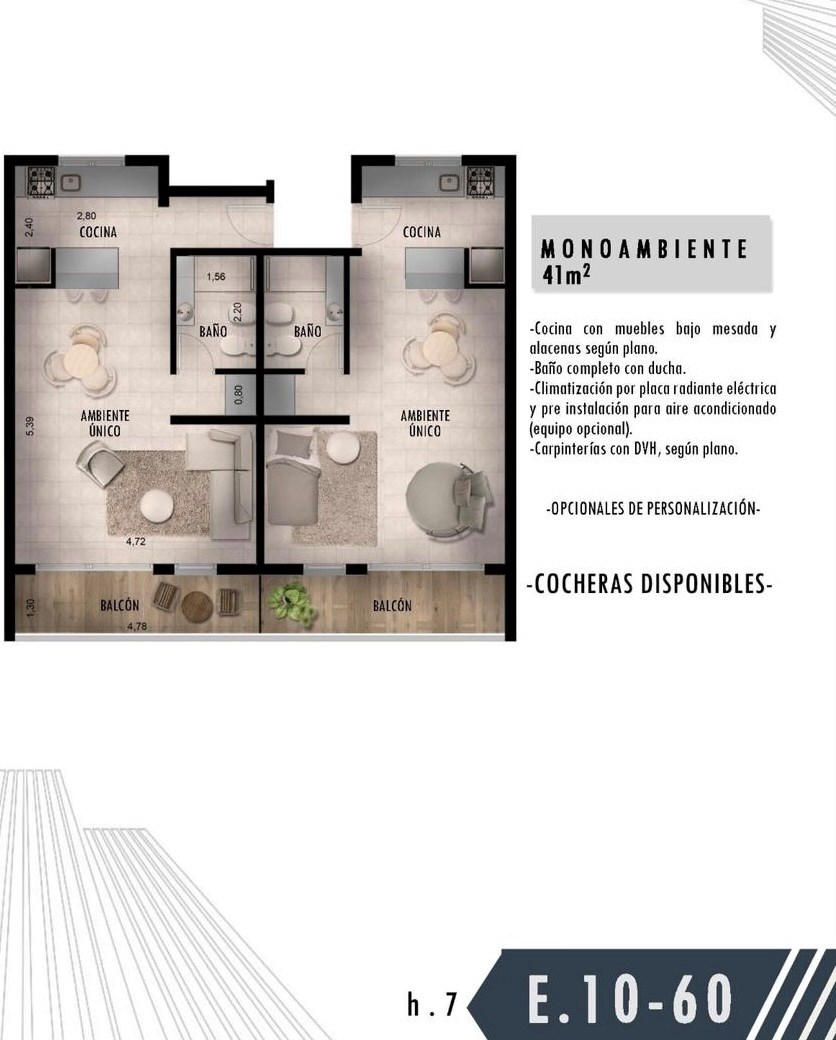 Unidades pensadas como viviendas, estudios/oficinas, organizadas en una planta tipo con departamentos MONOAMBIENTE de 42 m 2 al frente. Los mismos cuentan con frente de placard integral en dormitorios, cocina semi-integrada al Estar-Comedor, con mueble bajo mesada, alacena y pre instalación para lavarropas, baño completo con ducha, doble ventilación e iluminación natural. Climatización por placa radiante electrica y pre instalación de Aire Acondicionado. Carpintería con DVH.