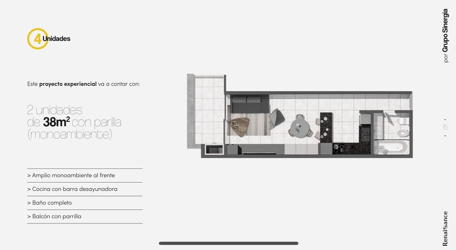 Calle 37 e/ 7 y 8. EMPRENDIMIENTO DE VAGUARDIA EN BARRIO NORTE LA PLATA, RENAISSANCE. Departamento monoambiente ubicado en el primer piso al contrafrente Baño completo, Balcón con parrilla. También nos encontramos con artefactos y griferías de primera marca (FV), isla en todas las unidades, Bajo mesada MDF negro, Revestimiento de porcelanato, Marmolería en Negro Brasil/Guidoni Blanco en baño y acceso monitoreado, Marcamos la diferencia en nuestro emprendimiento, aplicando calidad y distinción. Las mismas cuentan con Puerta de ingreso e interiores a medida, Carpintería aluminio DVH , Piso vinílico SPY en las habitaciones, Pre instalación de aire acondicionado, Frente e interior de placard y Climatización por radiadores. Renaissance propone espacios de encuentro en un subsuelo con amenities, espacio de bar, co-work y multispace Entrega estimada: Marzo 2026.