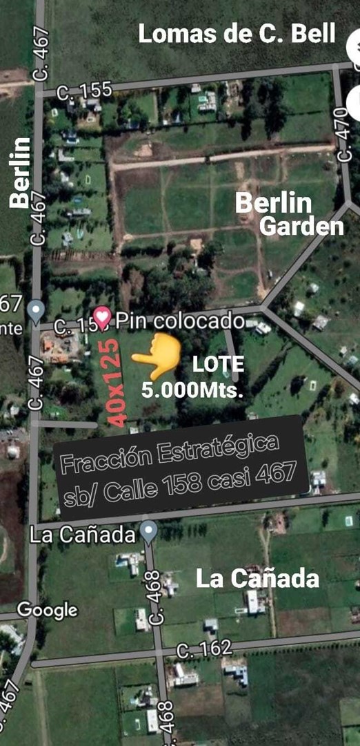 Lote en 158 entre 467 y 470 ÚNICO LOTE MULTI OBJETIVOS en la zona – 5.000 m² (40 x 125) – Este lote se distingue por su versatilidad y preparación completa para múltiples proyectos. Servicios garantizados: Gas Natural y Electricidad en la puerta. Factibilidad de Agua aprobada por COSEGO y Municipalidad. Infraestructura avanzada: nivelado, perímetrado con alambre olímpico y pared estilo piedra, alcantarillado con acceso entubado en un 25%. Seguridad hidráulica: Estudio aprobado por ADA, un aspecto clave en la zona. Un terreno listo para construir, con todas las condiciones técnicas y legales resueltas, ideal para emprendimientos residenciales, comerciales o recreativos.